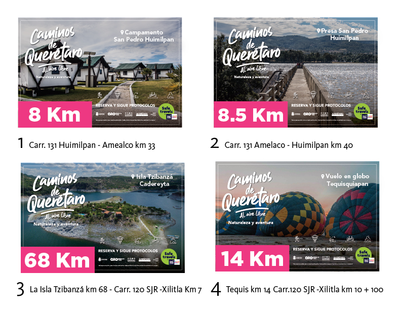 La imagen de las señales está alineada con la campaña “Caminos de Querétaro”, que busca promover el turismo doméstico, en concordancia con la situación de la pandemia por COVID-19 y las medidas sanitarias que se han establecido en el territorio estatal.